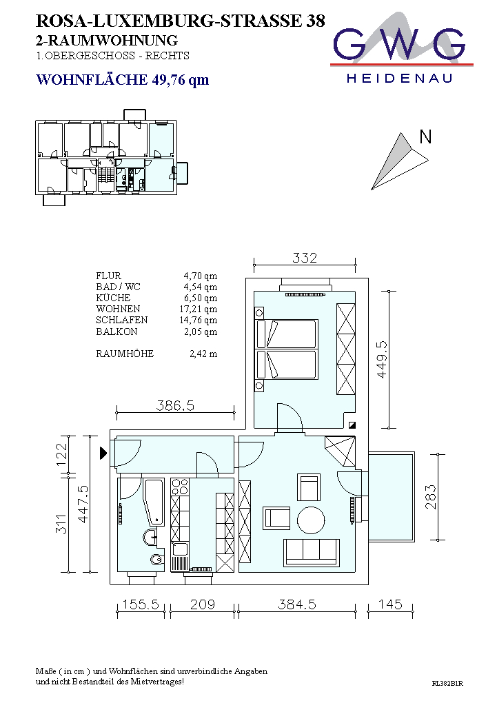 Die Wohnung mit Balkon wird bezugsfertig vorgerichtet. Küche mit Fenster. Bad mit Wanne. Wanne mit Duschaufsatz und Wannentür. Zur Wohnung gehört ein Keller.